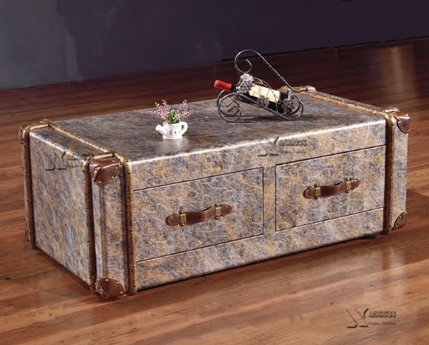 This vintage – style rectangular storage trunk with drawers features a unique patterned surface, resembling an antique design. The leather trims and metal details add a touch of rugged charm, making it a perfect blend of style and function for European interiors.